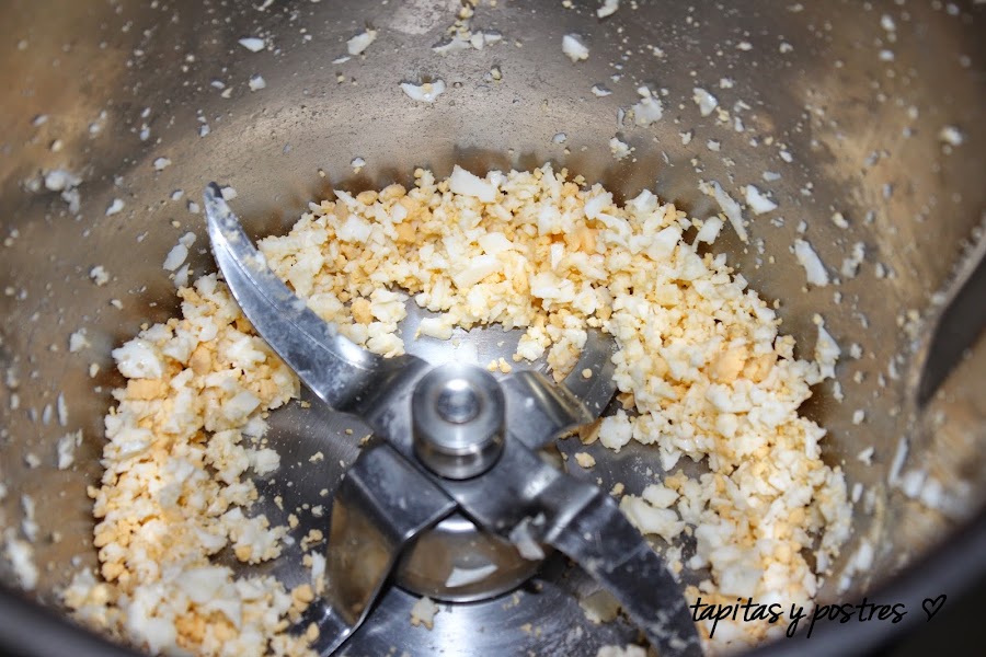 Ahora, ponemos el huevo cocido en el vaso de la thermomix y lo picamos. El hacerlo en la máquina es porque lo pica en un segundo y lo deja genial.