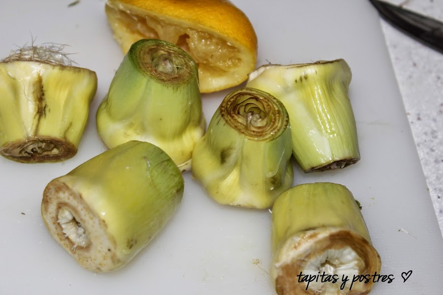 Le quitamos todas las hojas duras, dejamos solo el corazón. Se desperdicia mucho, pero es la parte más tierna. Las frotamos con medio limón.