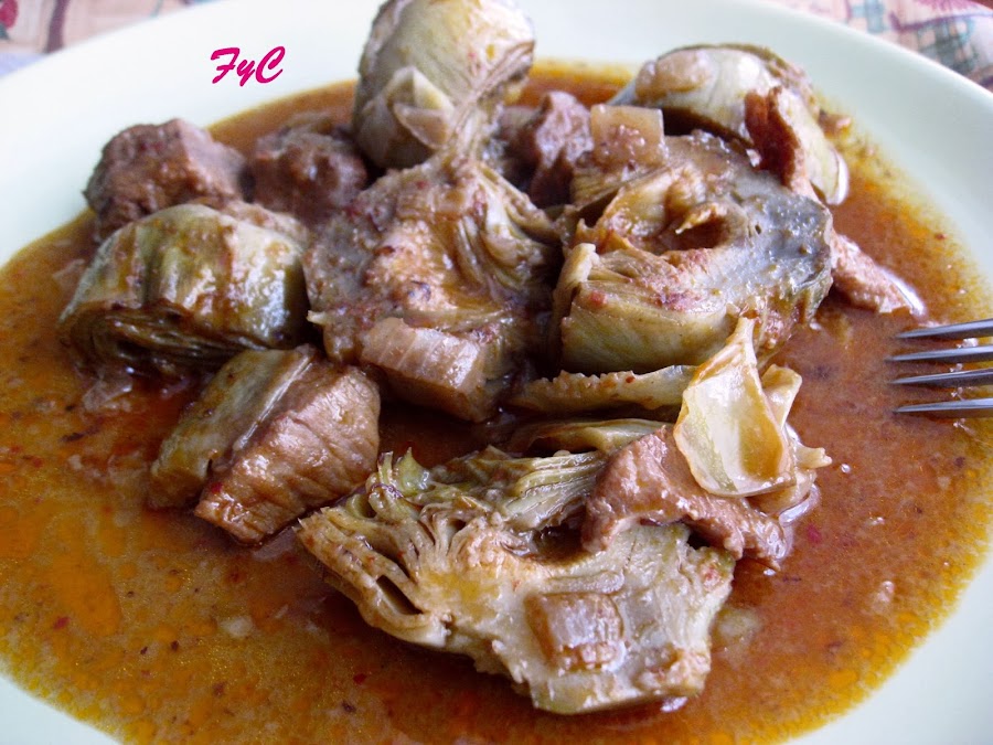 9 alcachofas, 1 cebolla, 1 cucharada de pan rallado, 1 cuchara de carne de pimiento choricero, 1 vaso y medio de agua, 1/2 vaso de pedro ximénez, 1 pieza de secreto ibérico, aceite, sal.
