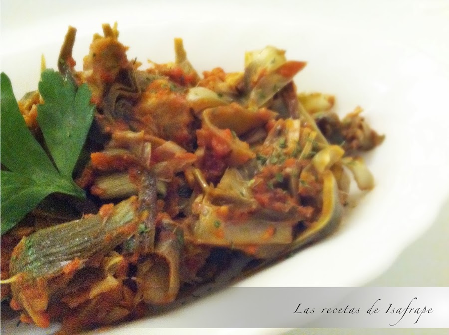 Cuando las alcachofas estén casi tiernas agregamos el tomate triturado al gusto, un chorro de vino blanco y el perejil picado, rehogamos y cuando empiece a hervir bajamos el fuego. Cocer hasta que las alcachofas estén tiernas y el tomate hecho.