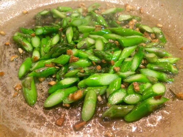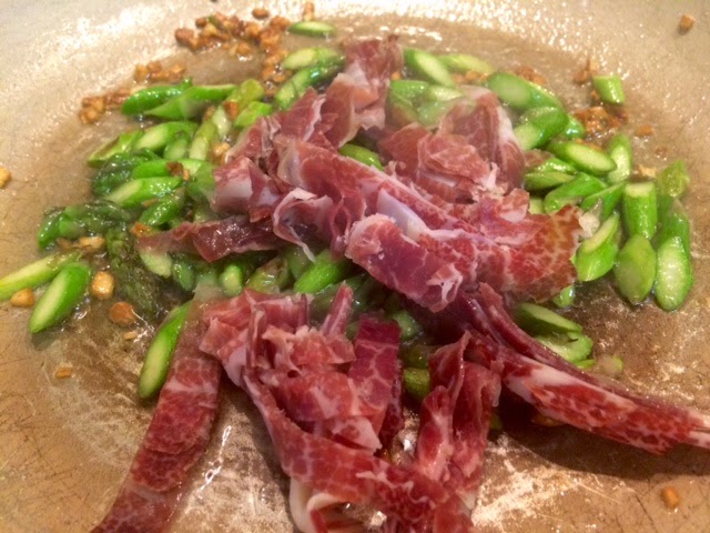 En la misma sartén, saltear los espárragos trigueros durante un par de minutos, echar una pizca de sal y añadir el jamón (rehogar muy poco...unos 15 segundos) y añadir las alcachofas.