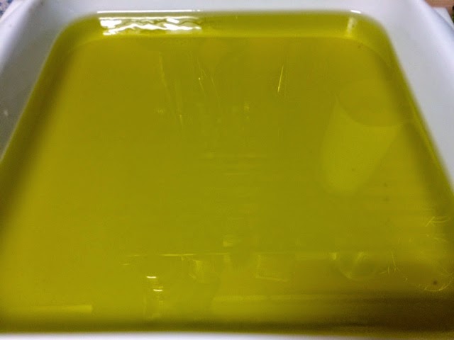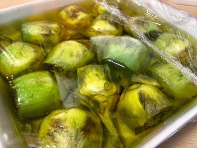 Limpiar las alcachofas y cortarlas por la mitad o si son muy grandes, en cuartos y sumergirlas en la fuente con el aceite. Tienen que quedar cubiertas las alcachofas con el aceite.