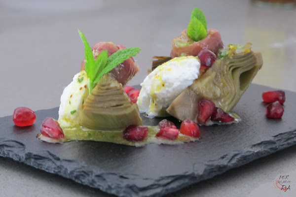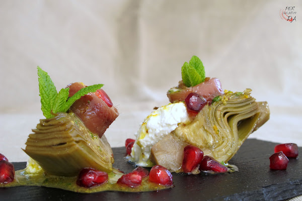Y una vez tenemos las alcachofas confitadas, vamos a preparar en cinco minutos un aperitivo o entrante de auténtica fiesta.