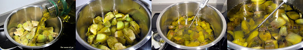 En la zona mediterránea la temporada de primavera proporciona frutos de primera calidad, como estos que conseguimos en la Fiesta de la alcachofa (Carxofada) de Sant Boi de Llobregat y que aprovechamos para presentar con una técnica de cocción fácil y sencilla, el confitado en aceite, que mantiene muy bien la esencia del producto original.