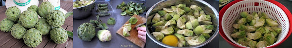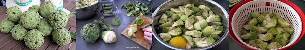 Limpiar y pelar las alcachofas retirando las hojas exteriores duras (recordar la regla: cuando creas que ya le has quitado bastante, quítale dos capas más). Desechar la punta (aproximadamente una tercera parte de su longitud total) y cortar en cuatro o seis trozos cada pieza en función del tamaño.