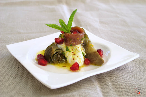 Colocar primero un par de trozos de alcachofa en el plato, y sobre ellas una cucharadita de mató (queso fresco similar al requesón). Coronar con un filete de anchoa y repartir unos granos de granada. Aliñar con la vinagreta de naranja y decorar con unas hojitas de menta fresca.