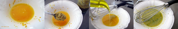 Rallar en un bol la piel de media naranja. Exprimirla y añadir el zumo.