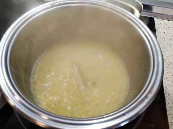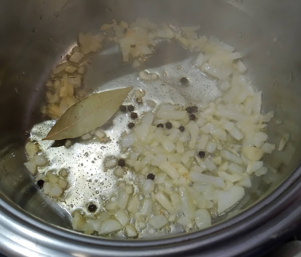 Echar en una cacerola puesta a fuego medio, el aceite de oliva y pochar la cebolla y los ajos removiendo hasta que comience a dorar incorporando la hoja de laurel y los granos de pimienta.