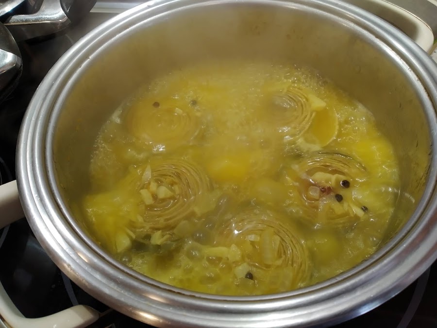 5 alcachofas, un trozo mediano de cebolla blanca dulce, dos dientes de ajo, seis granos de pimienta negra, un vaso pequeño de vino blanco fino amontillado, una hoja de laurel, medio limón, medio vaso pequeño de aceite de oliva virgen extra, dos cucharadas soperas de harina de trigo, dos vasos medianos de agua, sal y un sobre de azafrán molido (en su defecto colorante alimentario).
