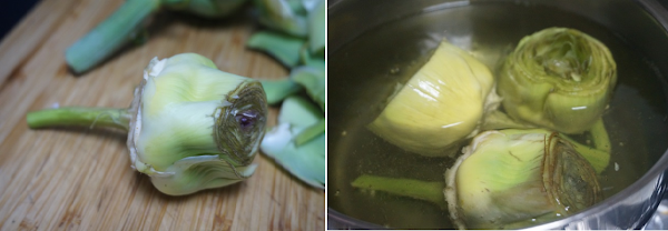 Empezaremos limpiando las alcachofas. Empezaremos quitando las hojas duras hasta llegar alas que están más blancas y tiernas. Podemos dejar el tronco. Ponemos una cazuela con agua y un chorro de zumo de limón al fuego, cuando estén las alcachofas limpias las podemos cortar por la mitad o en cuartos, las ponemos en la cazuela que se cuezan durante 15 minutos.