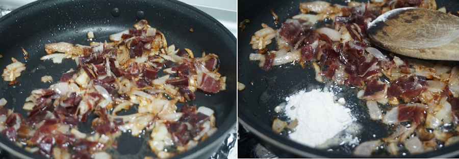Cuando tenga un poco de color la cebolla añadimos el jamón. Lo rehogamos todo junto. En un lado añadiremos la harina y removemos para que se cocine un poco la harina.