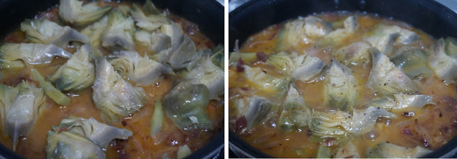 Cuando estén las alcachofas cocidas las sacamos y escurrimos, no tiraremos el agua. Cogemos un vaso del agua de la cocción de las alcachofas y la añadimos a la sartén junto con el sofrito y el jamón. Ponemos las alcachofas en la cazuela añadimos un poco de pimienta. Probamos de sal ya que el jamón es salado, si hace falta ponemos un poco. Dejamos cocer 5 minutos y listo.