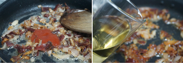 Añadimos las dos cucharadas de tomate frito, removemos para que mezclen los ingredientes. Incorporamos el vino blanco y dejamos que reduzca el alcohol.
