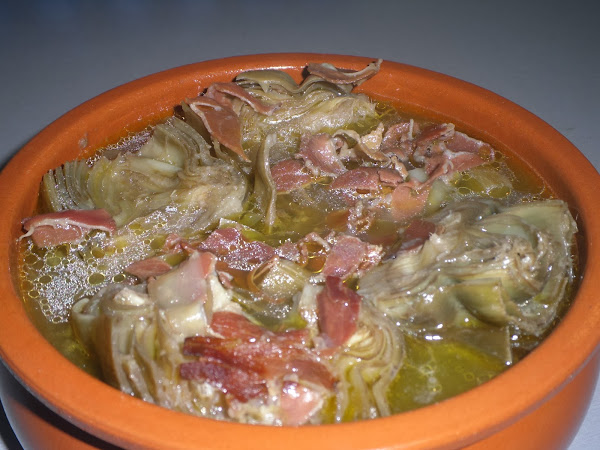 A parte rehogamos en una olla el jamón junto con el ajo, cuando ya lo tengamos añadimos las alcachofas escurridas y el pan rallado. Dejamos que se mezclen y se fusionen los sabores para posteriormente cubrir con agua.