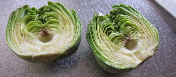 Lo primero que tenemos que hacer es limpiar las alcachofas, para ello vamos quitando las hojas más duras hasta dejar las más tiernas, posteriormente cortamos la parte superior y el tallo, de esa manera nos quedaremos con el corazón de la alcachofa. Os pongo una foto de como quedarían una vez limpias.