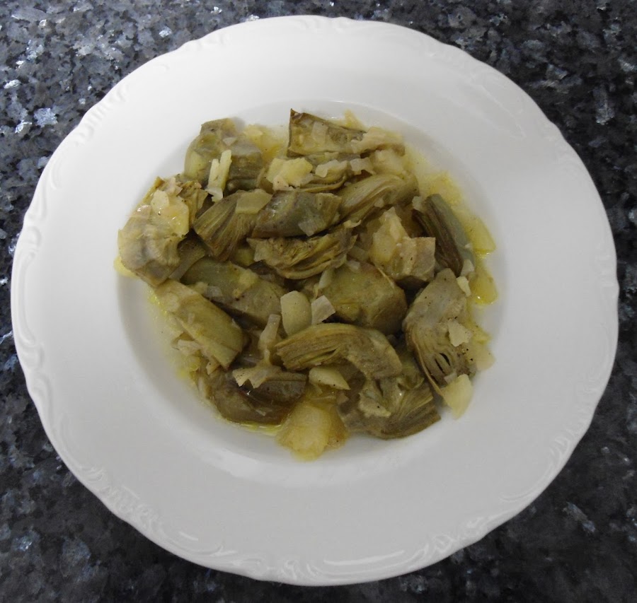 Limpiar las alcachofas y cocerlas, mientras en una sarten se echa un poco de aceite, se corta en trozos pequeñitos la manzana, la cebolleta, el apio, el ajo se le añade el vino la mostaza y las alcachofas bien escurridas, todo se morea hasta que este echo (se le echa una poquita de agua para que cueza todo y se quede en una salsita)