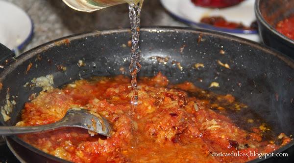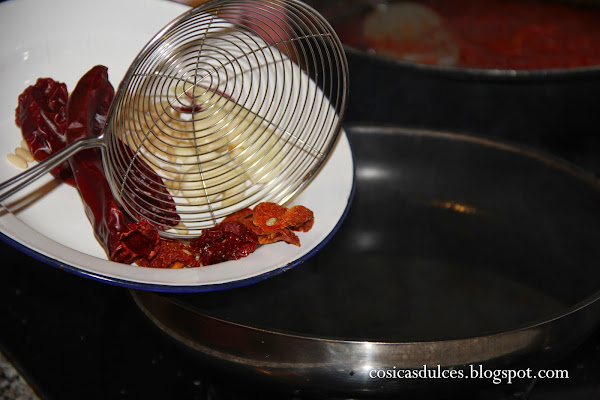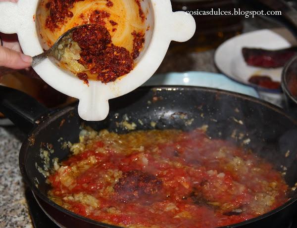Comenzamos por freir los pimientos choriceros, los ajos y los piñones. Reservarnos uno de los pimientos fritos y con el resto de ingredientes hacemos una picada.