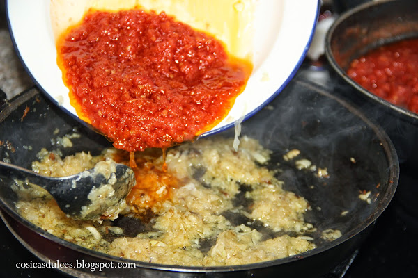 En el mismo aceite (si es necesario podemos añadir un poquito más) freímos la cebolla rallada hasta que esté doradita y el tomate que podemos freírlo directamente o tenerlo frito previamente.