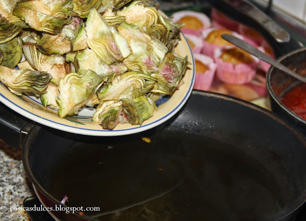 Limpiamos las alcachofas hasta dejar sólo el corazón y las cortamos en cuatro. Las freímos en el mismo aceite en el que hemos frito lo anterior. Cuando estén bien doradas las sacamos de la sartén y las pasamos a una olla.