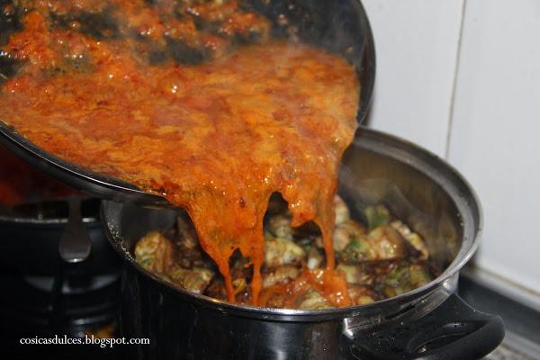 Por último vertemos todo este frito sobre las alcachofas que habíamos frito previamente. Añadimos el agua sal y pimienta al gusto y dejamos cocinar hasta que la salsa reduzca un poco. Las alcachofas deben quedar blandas pero no deshechas.
