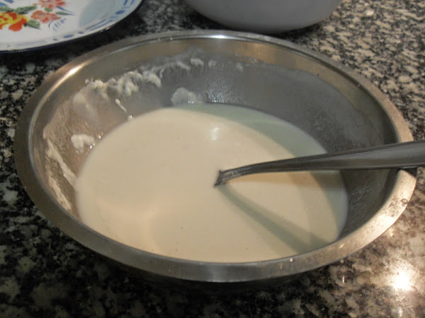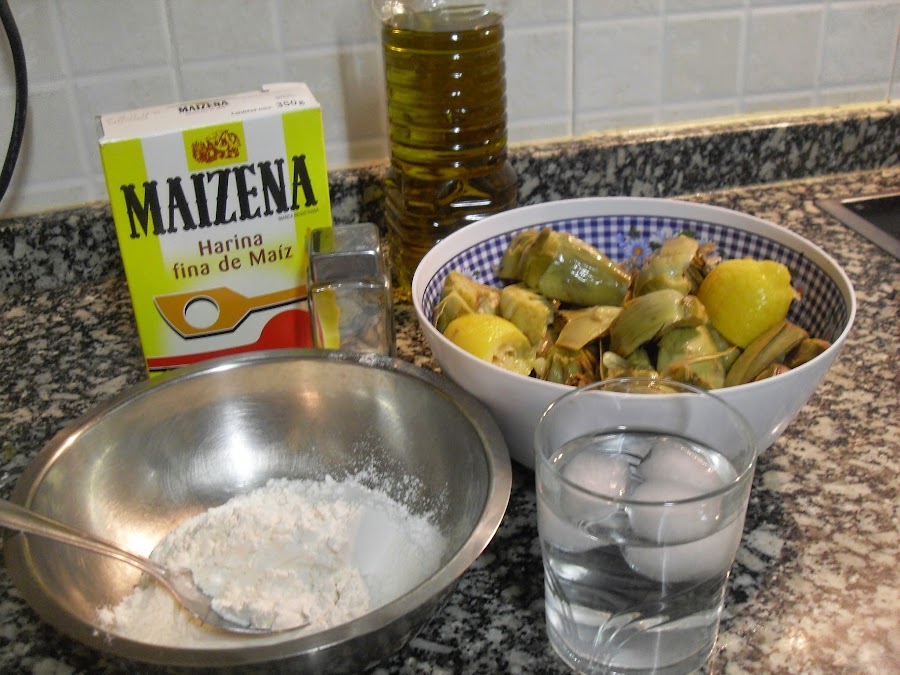 Para preparar la tempura:En un bol poner, 6 cucharadas de harina y 1 de harina de maíz y una cucharadita de sal, mezclar y agregar agua bien fría (yo la tuve con cubitos de hielo), lo justo para que quede una masa como las natillas. Mezclar todo bien con unas varillas.