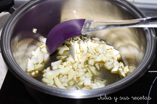 Ponemos aceite en la olla exprés, y sofreímos las cebolla y los ajos picaditos.