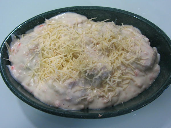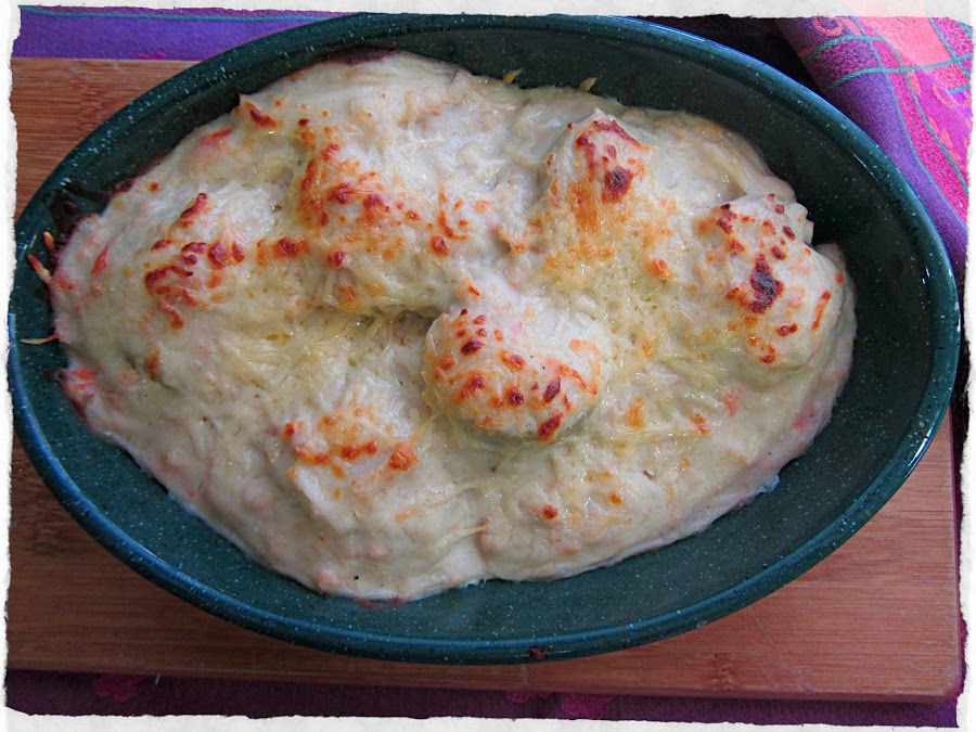 Cubrimos las alcahofas con la bechamel. Espolvoreamos con queso rallado, y gratinamos a 220º durante unos 15 minutos (hasta que se dore un poco la superficie).