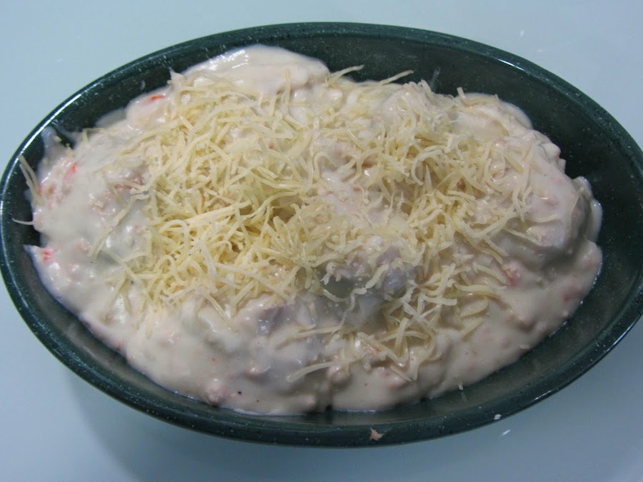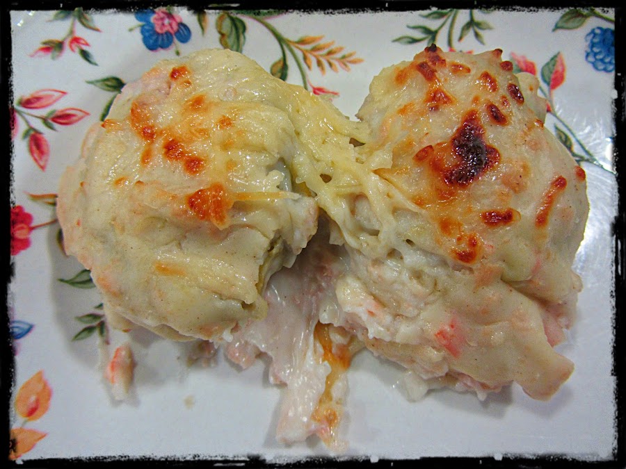 Una vez preparada, la mezclamos con el resto del relleno, y con los palitos de cangrejo picaditos.