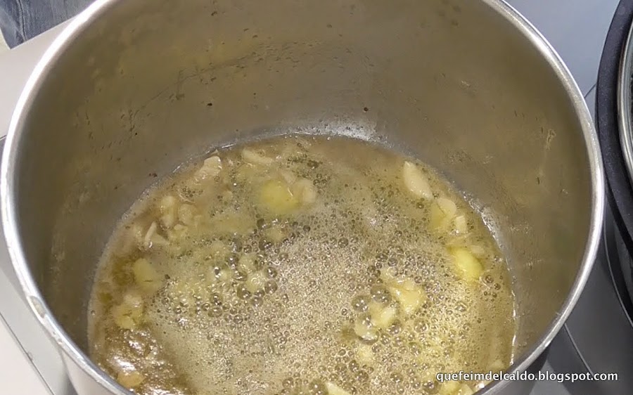 Una vez fundida la mantequilla le añadimos los dientes de ajo que previamente hemos pelado y picado, así lo dejamos hasta que doren los ajos.