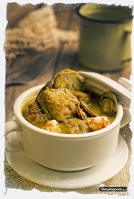 Por último las añadimos al caldo y dejamos que cueza todo a fuego lento durante 20-25 minutos para que nos espese la salsa. Cuando queden 5 minutos añadimos las almejas. No las añadáis antes o quedaran muy secas.