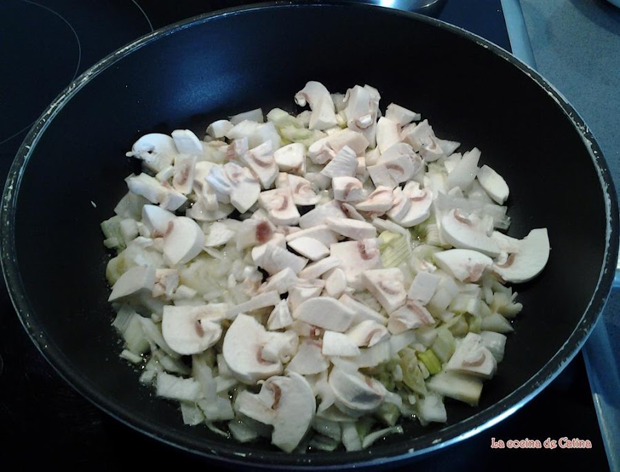 Con el resto del aceite, sofreír la cebolla y los champiñones picados.