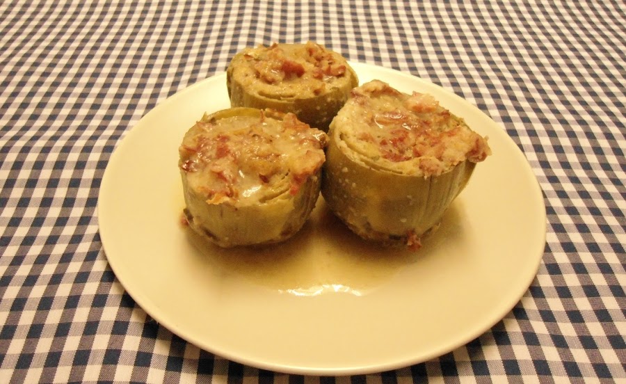 Para rellenarlas se hace una mezcla con el jamón, el pan rallado (1 1/2 cucharada), el vino blanco el diente de ajo y el perejil muy picadito,se escurren y se van rellenando.