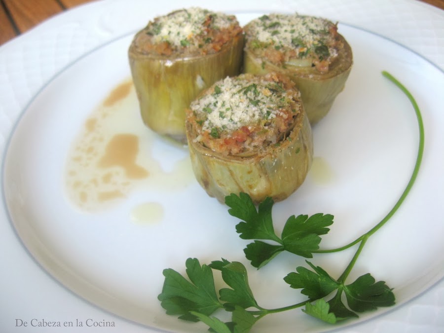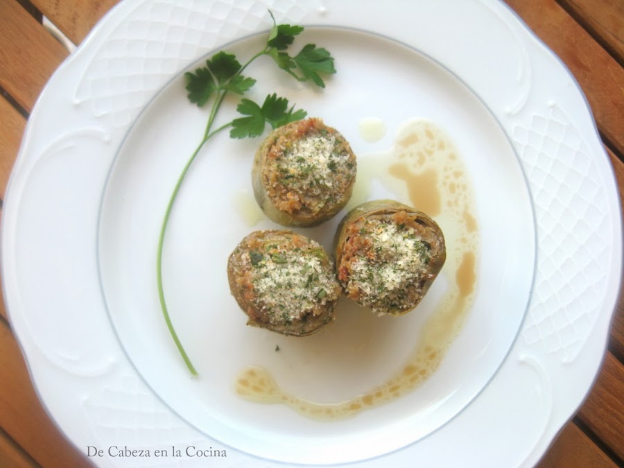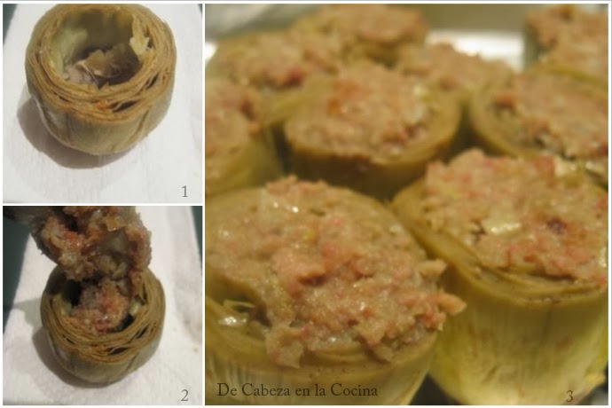 Con una cucharita, rellenamos las alcachofas y les regamos por encima miga de pan. Llevamos al horno pre calentado a 180º por 5-8 minutos.