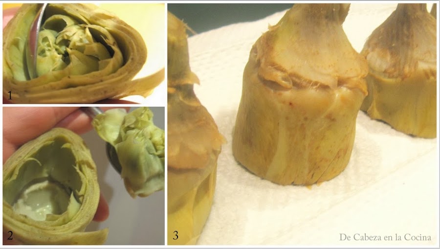 Ya limpias, ponemos al fuego un recipiente con agua y sal, las hervimos por 15- 20 minutos, cuando les entierres el cuchillo y este salga suavemente estarán listas, retirarlas del agua hirviendo y dejarlas escurrir y que se templen. Cuando ya las puedas coger, coge una cucharita de café y retírales el centro, resérvalo y ponlas boca abajo para que terminen de expulsar el liquido que les queda.