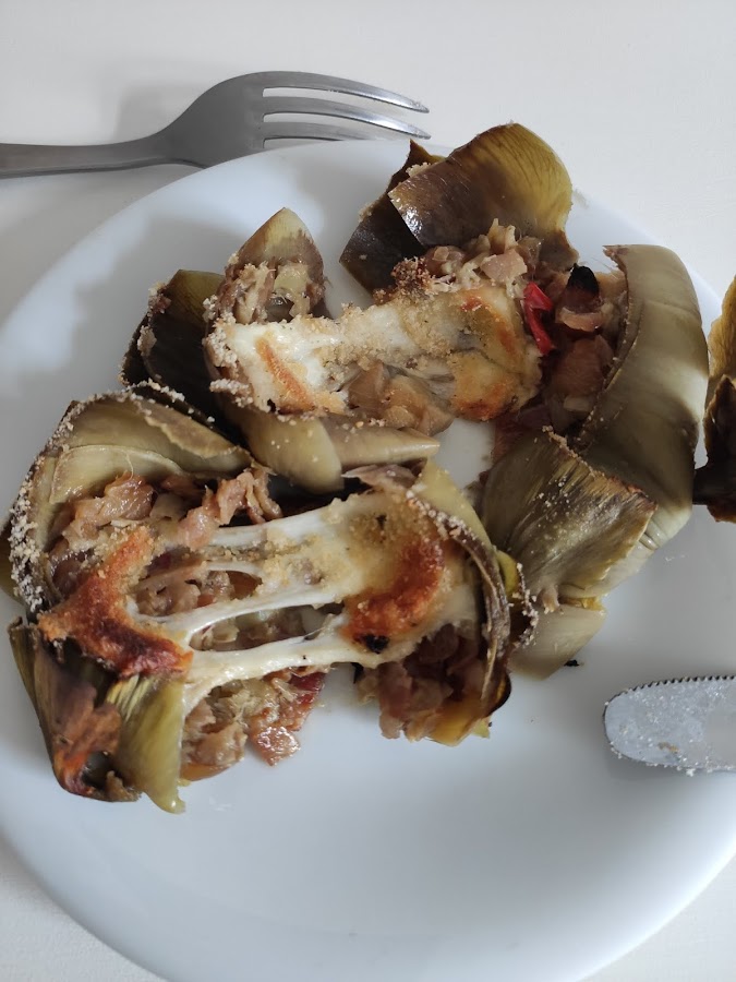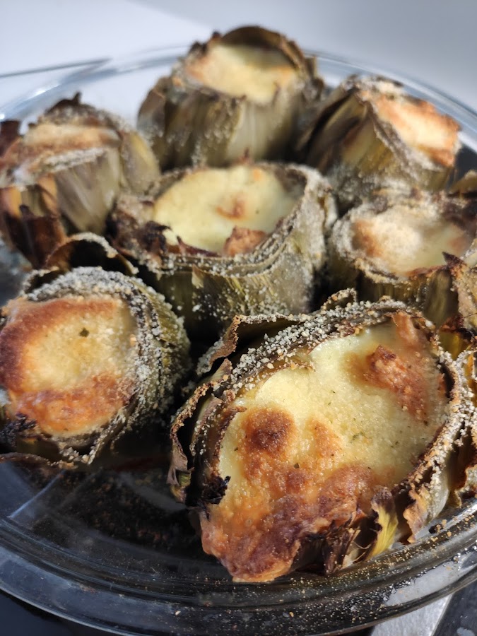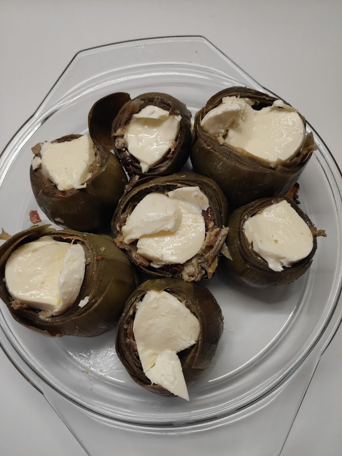 Precalentamos el horno a 220º. Colocamos las alcachofas en una fuente para hornear y las rellenamos con la farsa. Colocamos un poco de queso mozzarella encima de cada una y espolvoreamos con el pan rallado u un chorrito de aceite. Metemos la fuente en el horno durante 5 minutos. Servimos.