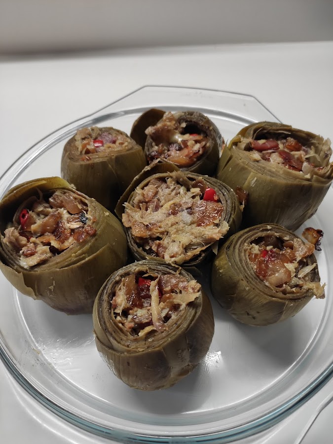 Para elaborar el relleno ponemos a calentar el aceite en una sartén, picamos finas las escalonias y las añadimos. Cuando estén pochadas echamos el jamón picado muy fino y si hemos decidido poner pimiento o chile lo añadimos aquí también picado fino. Vertemos el vino por encima y dejamos cocer hasta que se evapore la mitad. Finalmente incorporamos la carne del corazón de la alcachofa que hemos reservado y la pastilla o caldo y rehogamos otros 5 minutos.