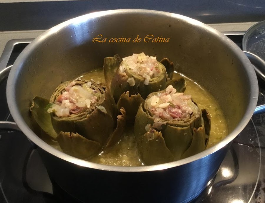 Mientras rellenamos las alcachofas con el picadillo de mano de cerdo.