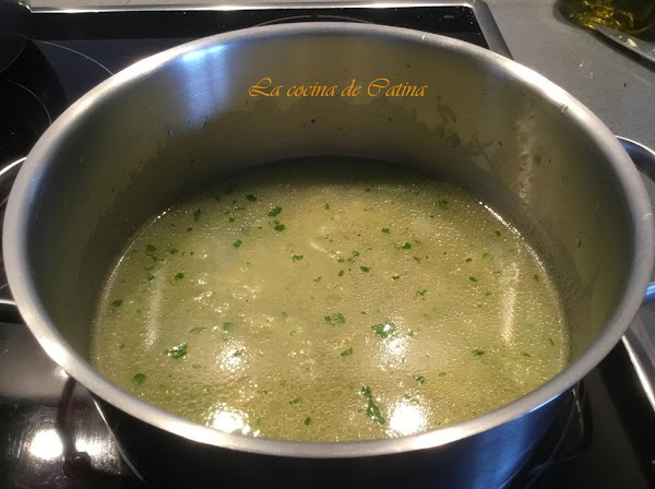 Aparte en una sartén con el aceite, doramos la cebolla, el ajo y el perejil picado, añadimos la harina, freímos durante un par de minutos y cubrimos con el vino y el caldo de cocer la mano. Salpimentamos y dejamos hervir durante 10 minutos.