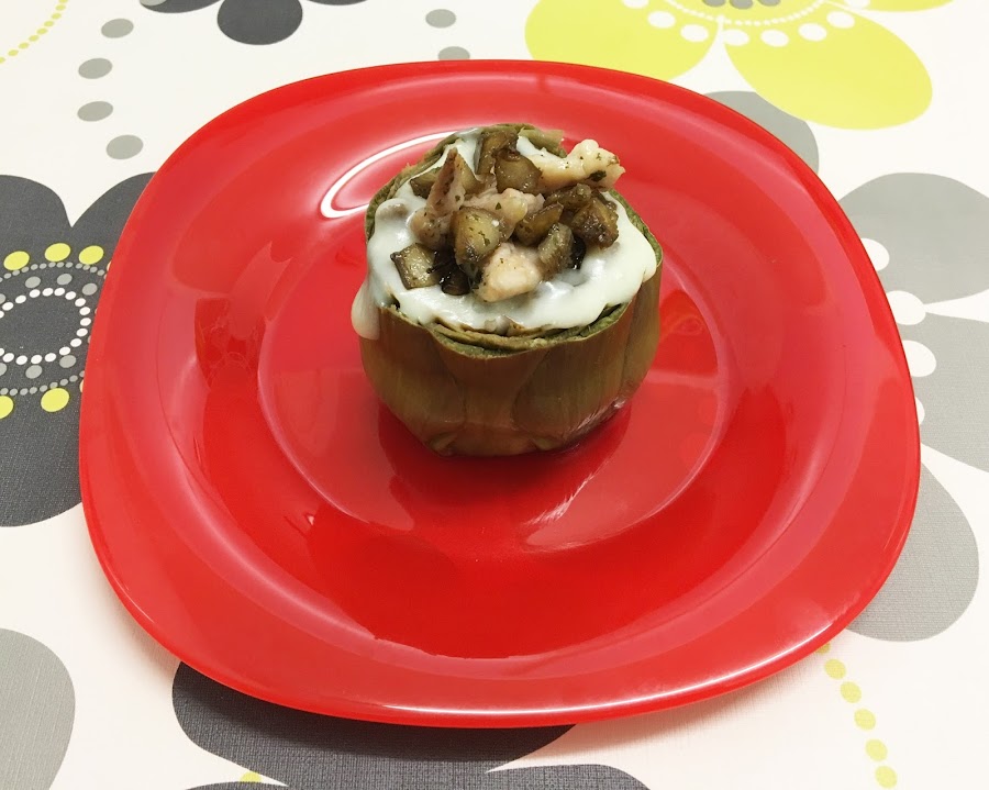 - Rellena las alcachofas y coloca un poco de relleno sin el queso por encima.