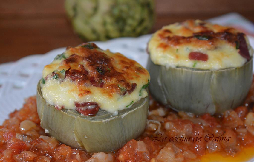 Batir el huevo, añadir el jamón, perejil picado, el queso chafado con un tenedor, sal y pimienta. Con esta mezcla, cubrimos las alcachofas.