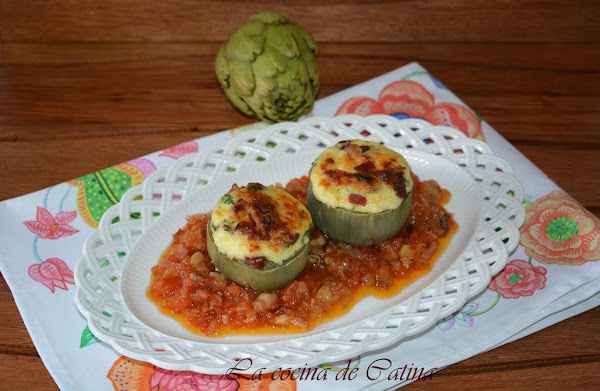 Ahora ponemos la salsa que hemos preparado en una fuente apta para horno, encima las alcachofas y las metemos al horno precalentado a 180 grados durante 10 minutos.