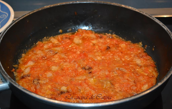 En una sartén con un chorrito de aceite, saltear el tocino y la cebolla, después añadir el ajo machacado y los tomates pelados y cortados en cuadraditos y freír durante 10 minutos.