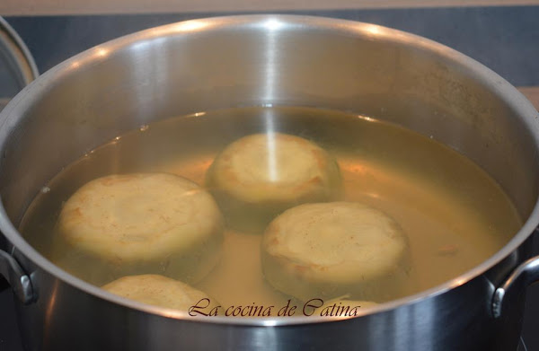 Quitar las primeras hojas de las alcachofas y cortar el resto a nivel del corazón, lavarlas bien con agua y limón y ponerlas a hervir en una cazuela con agua, sal y zumo de limón durante 20 minutos. Una vez cocidas escurrirlas y reservarlas.