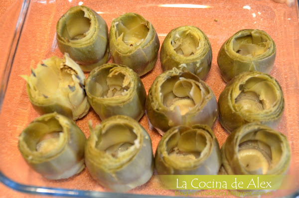 A continuacion limpiamos las alcachofas, vaciando con la ayuda de una cuchara el corazón que picaremos y reservaremos para utilizarla mas adelante.