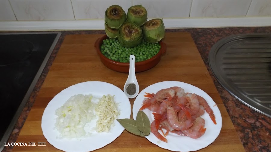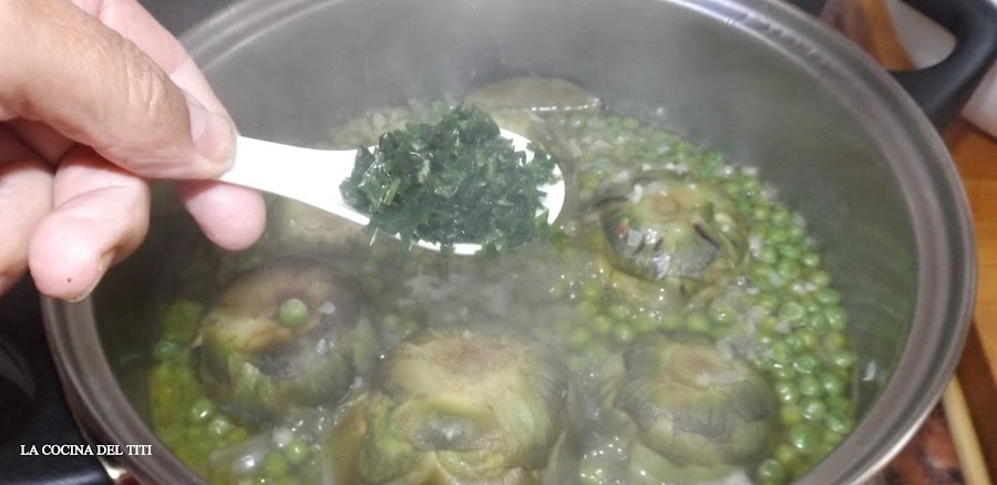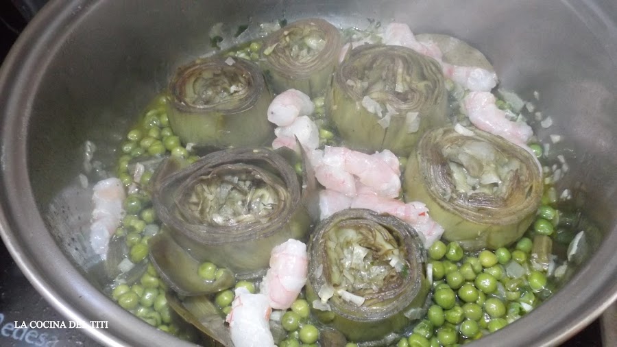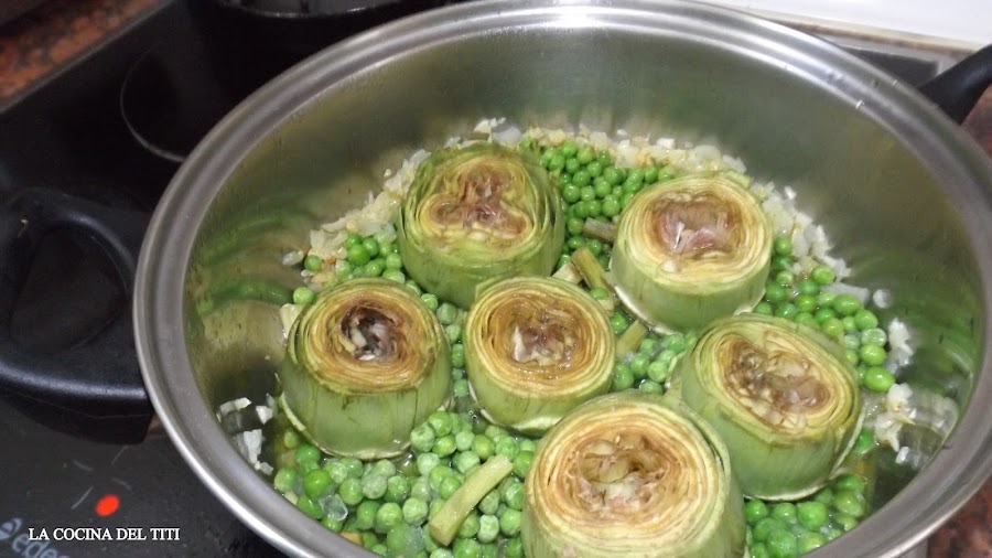 3º Añadimos los guisantes, los alcauciles y rehogamos durante 3 minutos.