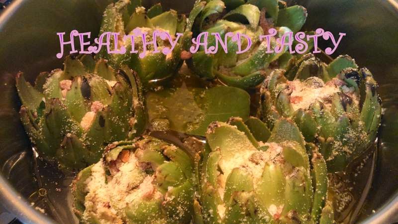 mezclamos el resto de ingredientes en un bol (jamón, ajo, perejil y pan rallado) y rellenamos los alcauciles con esa mezcla con ayuda de las manos. Metemos los alcauciles en la olla exprés. Añadimos agua hasta casi cubrirlos, un chorreón de aceite de oliva, una hoja de laurel y sal. Tapamos la olla y dejamos cocinar a fuego medio durante 20-30 minutos.