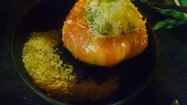 Tomate de huerta relleno de crema de albahaca y crujiente de ajo.