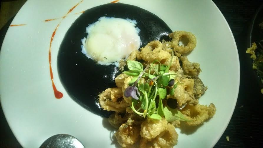 Cremoso de patata con tinta de calamar, huevo poché y chipirones.