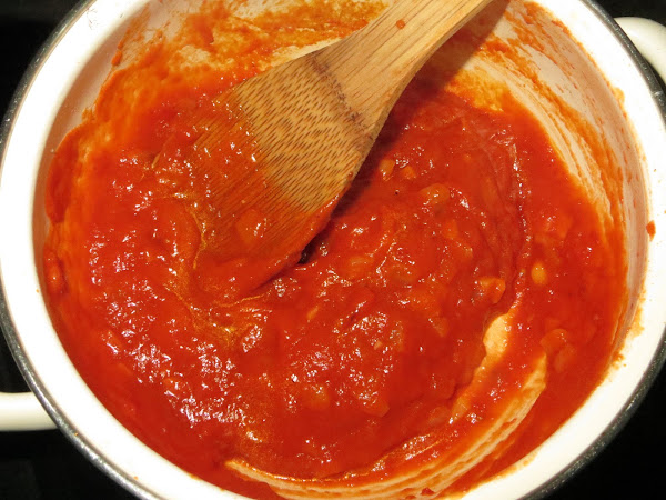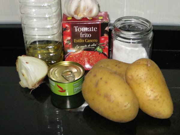 Mientras se están haciendo las patatas vamos haciendo nuestra salsa, echamos en una cacerola una cucharada de aceite, picamos el ajo y la cebolla y lo ponemos a pochar, cuando la cebolla esté transparente añadimos las alegrías riojanas, sólo he utilizado media lata porque pican bastante, pero si os gusta mucho el picante, utilizar la lata entera. Le dais varias vueltas, añadís el tomate y trituráis con una batidora.