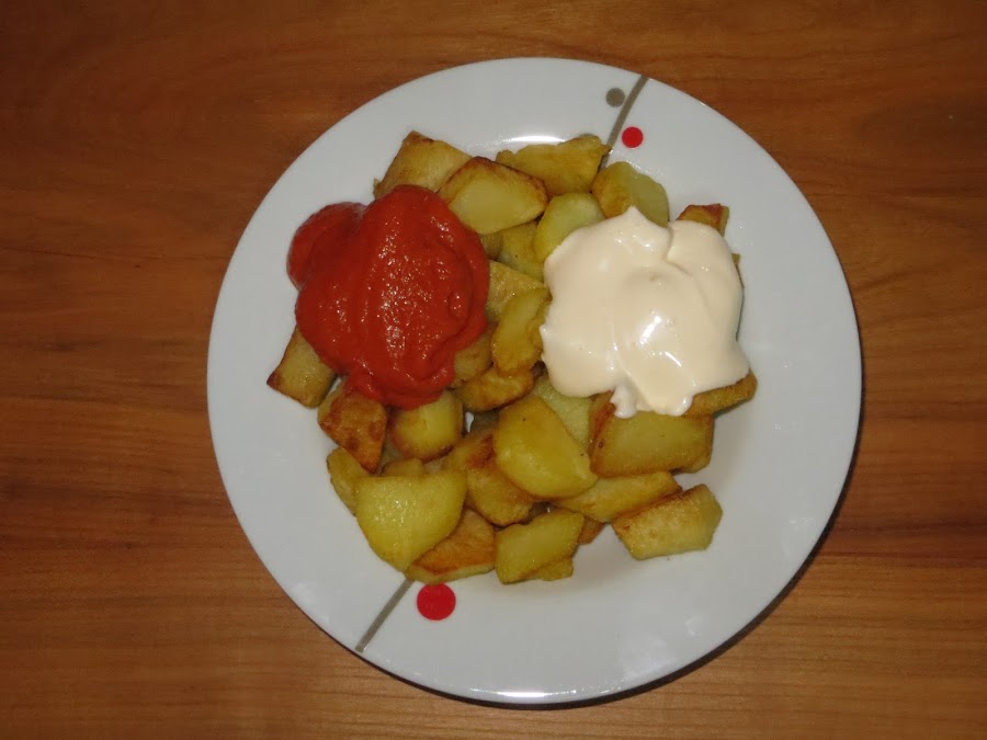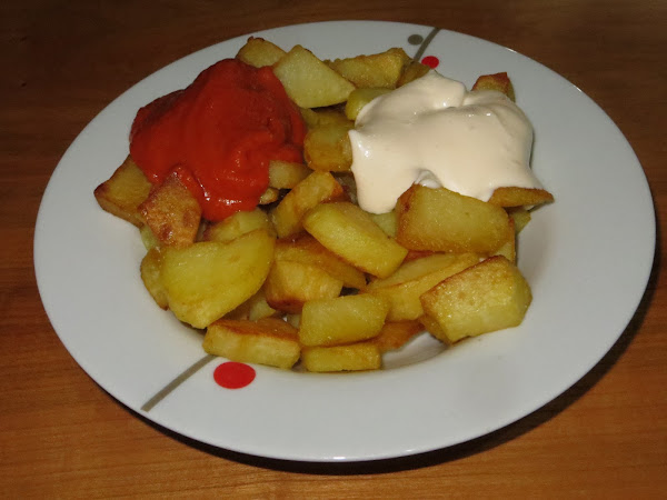 Echamos en un plato las patatas y añadís la salsa por encima, yo hice también mayonesa, para así que quedarán unas patatas mixtas y que la gente que no le gusta el picante las pudiera comer.